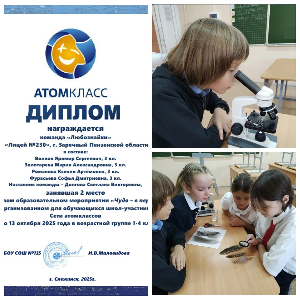 С 6 по 13 октября команда ребят 3 «В» класса приняла участие в сетевом конкурсе «Чудо – в перьях» для обучающихся школ-участниц Сети Атомклассов проекта Школа Росатома. Познавательная программа оказалась настоящим открытием для детей, позволив им погрузиться в захватывающую науку о пернатых друзьях. Ребята смогли не только получить новые знания об удивительных свойствах и особенностях строения птичьих перьев, но и применили их на практике. Команда «Любознайки» в составе: Волков Яромир, Золотарева Мария, Романова Ксения, Фурасьева Софья, была награждена Дипломом за 2 место.