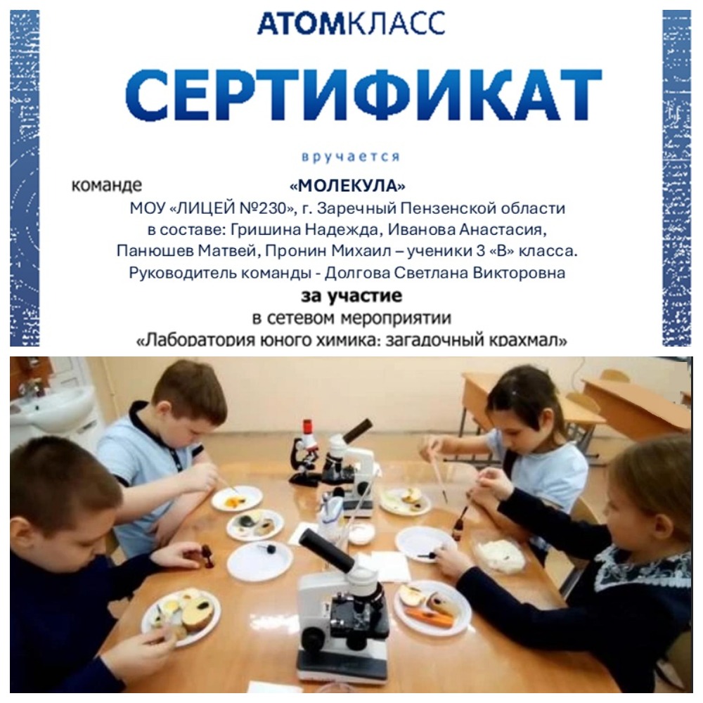 С 17 по 21 ноября команда ребята 3 «В» класса приняла участие в сетевом мероприятии «Лаборатория юного химика: загадочный крахмал» для обучающихся школ-участниц Сети Атомклассов проекта Школа Росатома. В ходе проведённых опытов ребята познакомились со свойствами крахмала, научились определять наличие крахмала в продуктах питания; получили заряд положительных эмоций и расширили свой кругозор! Команда «Молекула» в составе: Гришина Надежда, Иванова Анастасия, Панюшев Матвей, Пронин Михаил, была отмечена Сертификатом за участие.