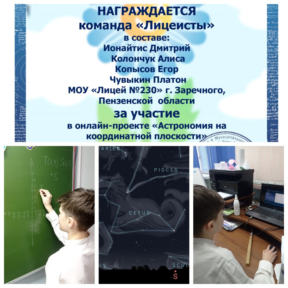 С 1 по 5 декабря команда 6-7 классов "Лицея №230" г. Заречного принимала участие в сетевом мероприятии «Астрономия на координатной плоскости», проводимом по инициативе МАОУ «Школа № 30 им. Л. Л. Антоновой» города Нижнего Новгорода Нижегородской области. В ходе подготовки к конкурсу обучающиеся смогли поработать с сайтом https://stellarium-web.org/ , где представлена карта созвездий, а также научились строить координаты точек в приложении GeoGebra. Работая сообща, ребята смогли увидеть и продемонстрировать взаимосвязь астрономии и математики. Результатом стала красочная презентации об одном из созвездий. Мы выбрали созвездие Кита
