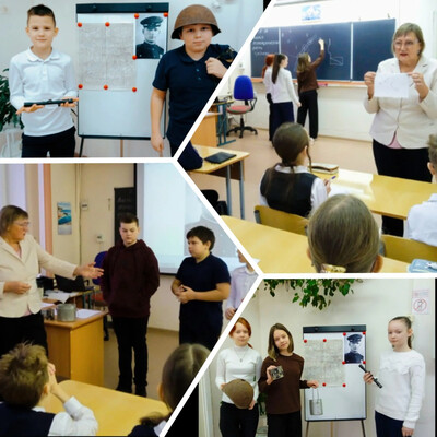 30 января в 5 "Б" классе прошёл музейный урок по теме: "Фронтовые будни". Экскурсовод городского музея - Расходова Ирина Геннадьевна рассказала о Георгице Льве Владимировиче, ветеране Великой Отечественной войны, работавшем много лет на заводе главным специалистом. Во время войны Лев Владимирович воевал на Ленинградском фронте, имеет медаль "За оборону Ленинграда". В своих воспоминаниях и поэме " Фронтовик " он без прикрас поведал о фронтовых буднях. Дети, затаив дыхание, с большим интересом слушали солдатские истории. Ирина Геннадьевна принесла предметы военного времени: офицерский планшет, каску, оптический прицел, котелки, карту и т.д.