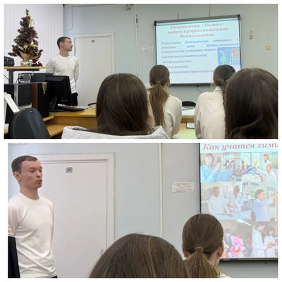 14 января в класс с направлением химия-биология пришел — Рожков Кирилл Игоревич, ассистента на кафедре "Химия и методика обучения химии". Он рассказал ребятам про направления в Пензенском государственном университете, связанные с химией! Мы узнали об условиях поступления в Пензенский государственный университет, а так же о специальностях учитель химии и биологии, химик-аналитик. Всю краткую информацию о кафедре собрали в буклете, который раздали всем ученикам! Эта встреча стала полезной в профориентации!